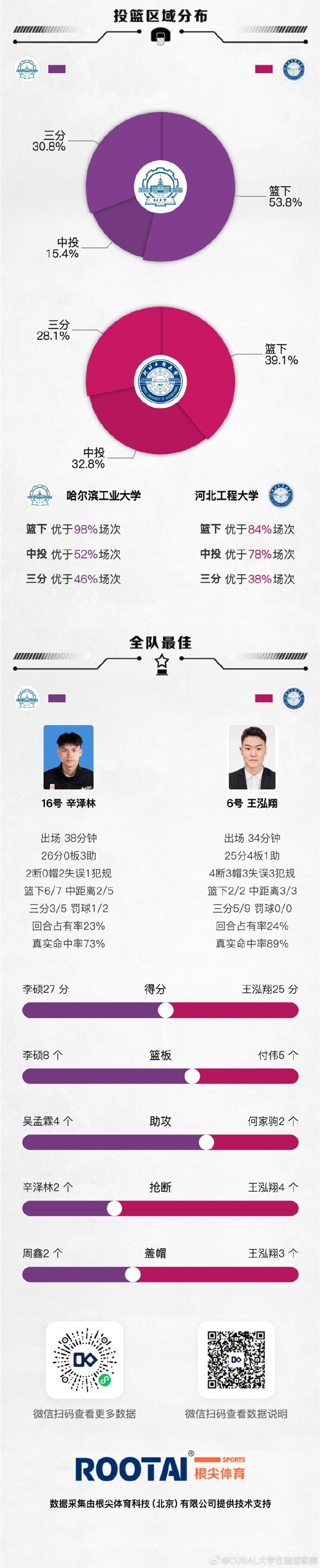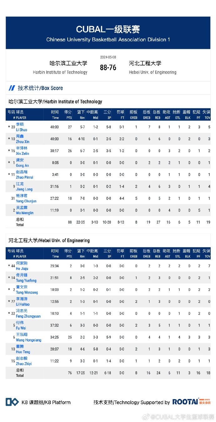 哈尔滨工业大学:李硕27分8篮板、辛泽林26分3助攻2抢断、周鑫16分6篮板、杨淳君18分5篮板2助攻、江龙1分6篮板3助攻。