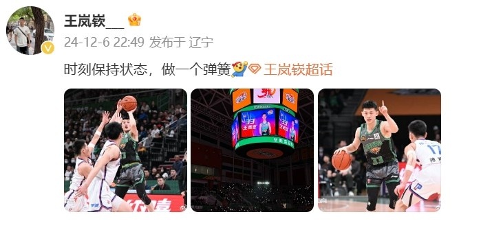 12月6日报道 CBA常规赛,辽宁111-76大胜天津。赛后,辽宁队后卫王岚嵚发博。