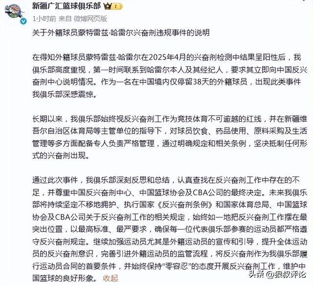 此前,新疆男篮官方也提到了哈雷尔在中国境内仅停留38天,出现此类事件我俱乐部深感震惊。