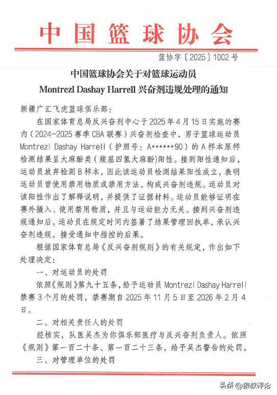 北京时间11月6日,根据中国篮协官方社媒公示,对于上个赛季新疆外援哈雷尔事件开出罚单,禁赛3个月,以及新疆俱乐部承担36000元的检测费用。具体如下: 此前,新疆男篮官方也提到了