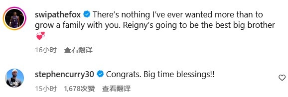 库里在评论区祝福道:“恭喜了!为你们献上大大的祝福!”