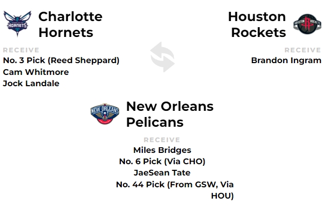 火箭得到:英格拉姆(鹈鹕)黄蜂得到:3号签选谢泼德(火箭)、惠特摩尔(火箭)、兰代尔(火箭)鹈鹕得到:迈尔斯-布里奇斯(黄蜂)、6号签(黄蜂)、泰特(火箭)、44号签(火箭)