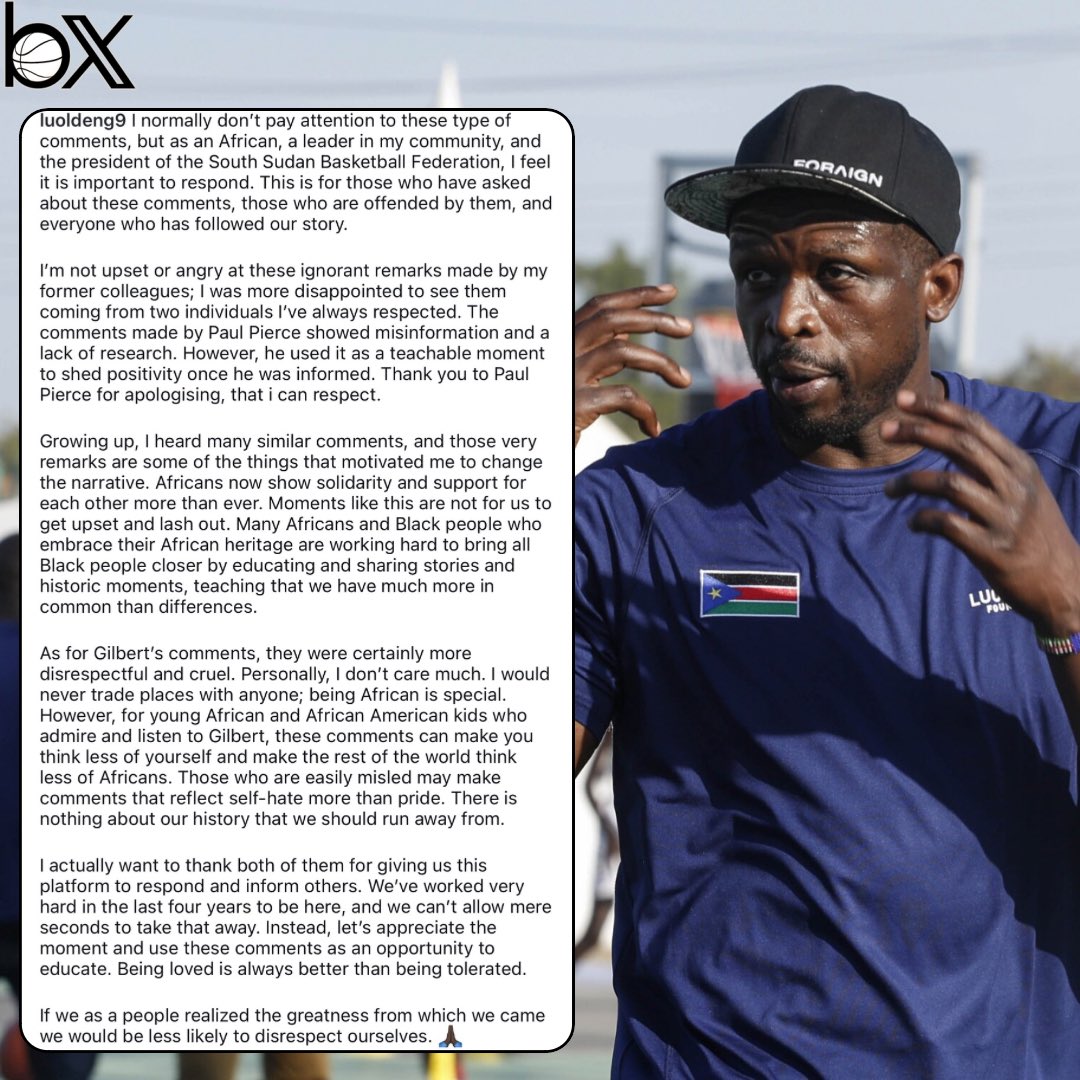 我通常不会在意这些评论,但作为一名非洲人,我所在社区的领袖,南苏丹的篮协主席,为了那些被问道这些评论、被这些评论所冒犯、关注我们故事的人,我觉得有必要做出回应。
