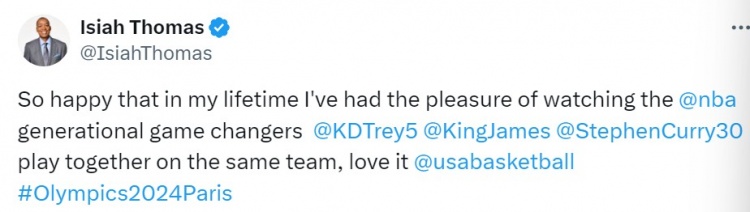 今天,NBA名宿“微笑刺客”伊塞亚-托马斯更推道:“很高兴在我的生命中还能看到NBA比赛的一代变革者杜兰特、詹姆斯和库里在同队打球,我爱美国篮球。”