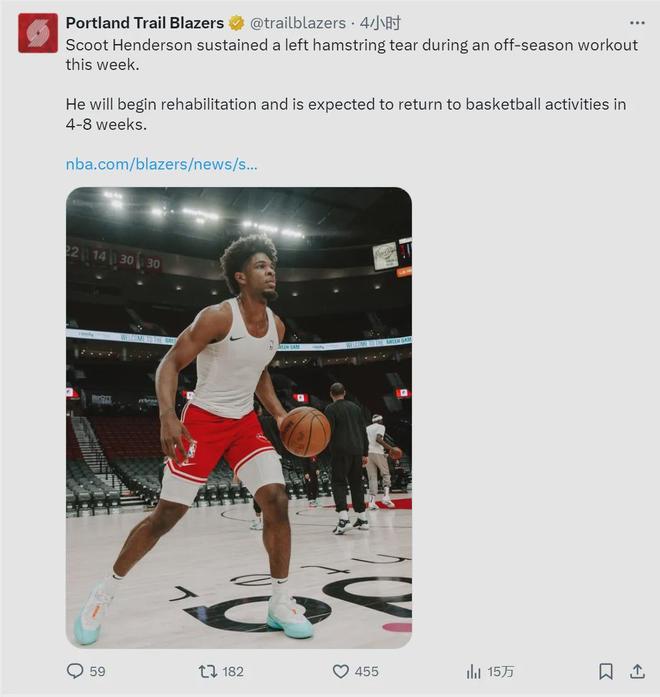 今年8月下旬的欧洲杯小组赛,博格丹也曾遭遇腿筋撕裂,如今已经过去了4周,他仍然没能回归赛场。按照亨德森缺阵时间推算,他遭遇的是二级撕裂。腿筋伤势容易反复,满血归来并不容易,开拓者要做好他长期缺阵的打算。