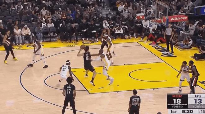 接下来后面的一个进球更加精彩:杨瀚森虽然前两次三分球出手都没命中,但勇士知道他有一手远投,一点都不敢给他空间。