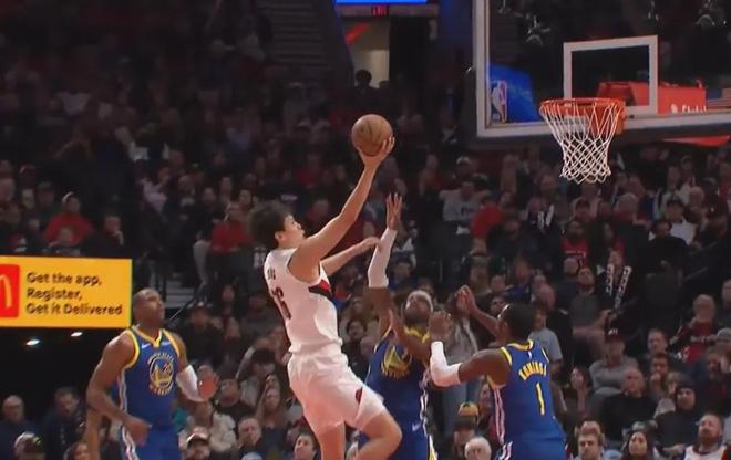 杨瀚森蹲在左侧底角,接球之后一个假动作,直接晃飞了老将霍福德,随后来了个慢三步突破,迎着勇士两个补防的球员就是一次低手上篮。
