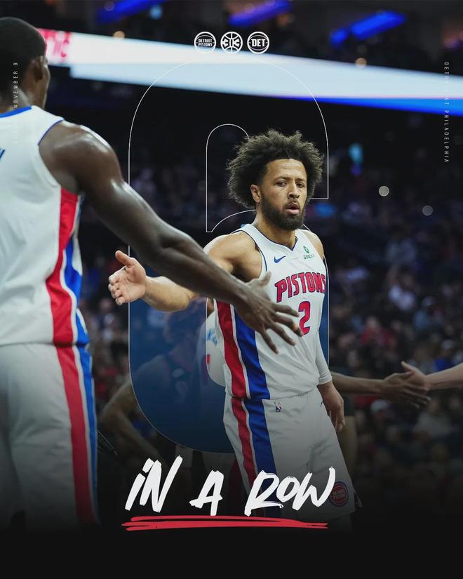 北京时间11月10日,NBA常规赛:活塞客场111-108险胜76人。末节还剩16.9秒,坎宁安后仰中距离跳投打进。随着马克西最后时刻绝平三分不中,坎宁安完成了准绝杀,活塞取得6连胜。此役过后,活塞8胜2负稳居东部第一。