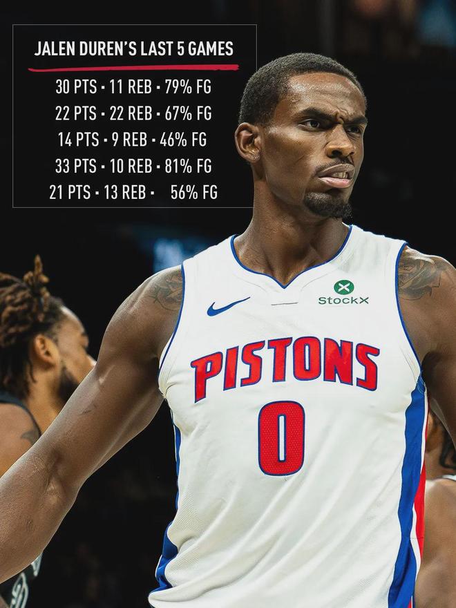 坎宁安的合同是5年2.69亿美元,本赛季正式生效,年薪4639万美元,2030年合同到期。当然,活塞能打成东部第一,只靠坎宁安一个人肯定不够。活塞内线杰伦-杜伦今天投篮11中8,罚球7中5,狂砍21分16篮板2抢断2盖帽。