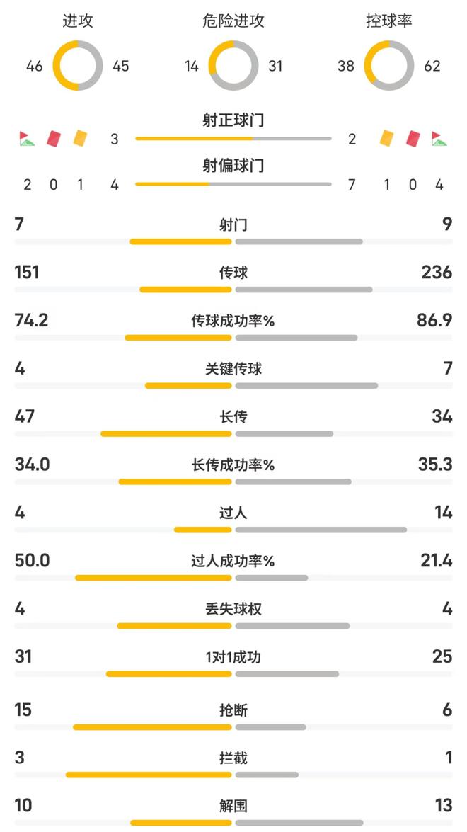 加拉塔萨雷vs红军半场数据:红军控球率62%、射门79