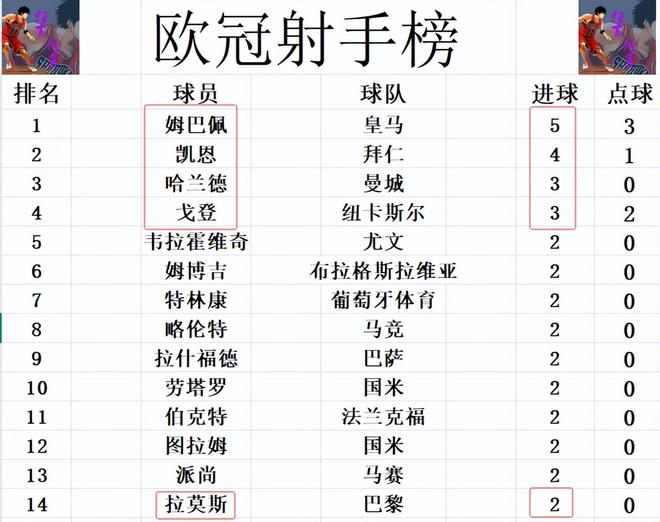 射手榜方面,姆巴佩5球领跑,凯恩4球排在第2。哈兰德今天梅开二度,戈登点射双响,两人3球升至第3。拉莫斯打入绝杀球,追上劳塔罗,拉什福德,韦拉霍维奇等人2球刚好挤入前十。