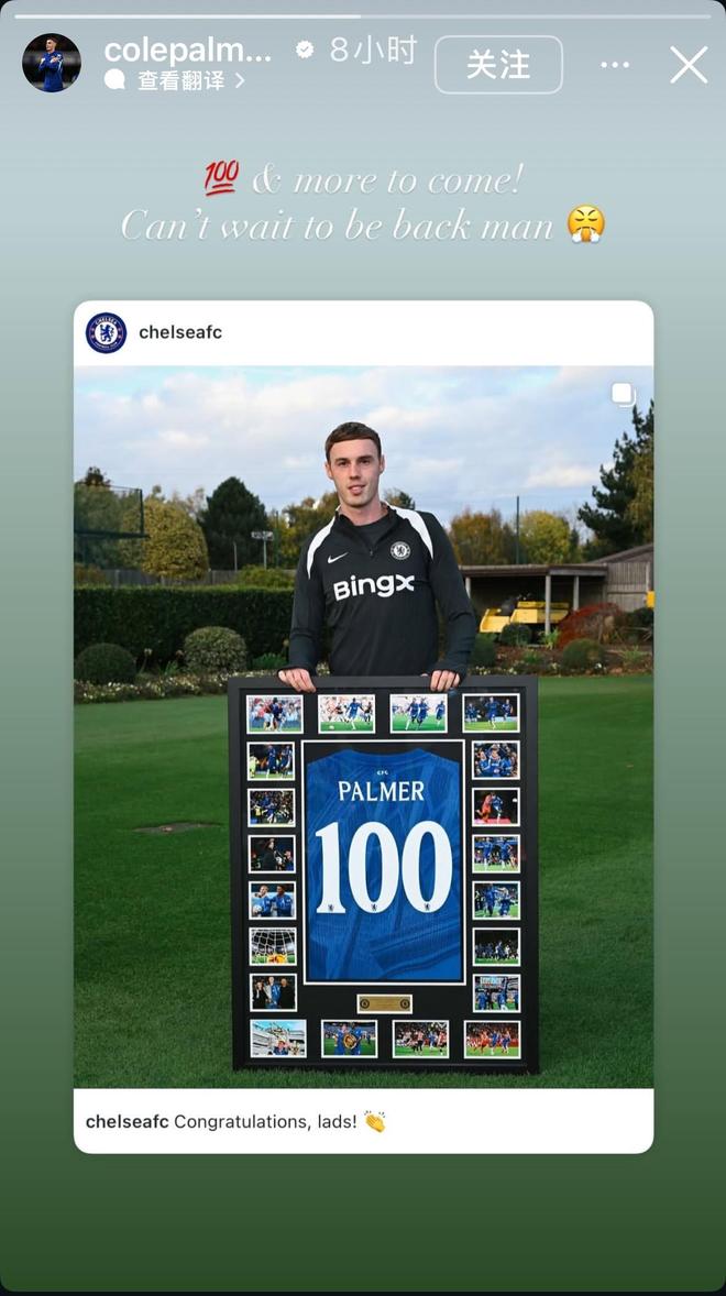 雷速体育10月29日宣 今日,切尔西球星帕尔默在社交软件上晒出自己的切尔西百场纪念球衣。并感叹道:“还会有更多,迫不及待想回归了!”