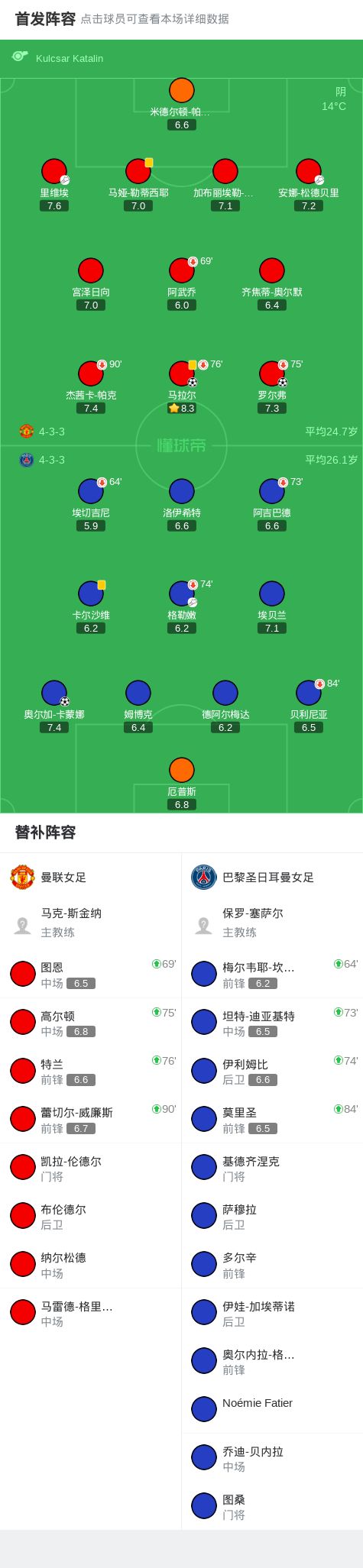 北京时间11月13日女足欧冠 联赛阶段 第3轮,曼联女足对阵巴黎圣日耳曼女足。曼联女足马拉尔破门,罗尔弗破门。巴黎圣日耳曼女足奥尔加-卡蒙娜破门。最终比分曼联女足 2-1 巴黎