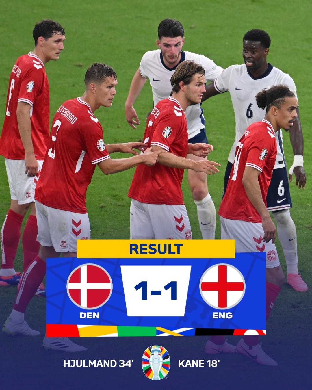 06月21日报道 欧洲杯第二轮,英格兰1-1丹麦,三狮军团1-0后大幅退守,但不久后被对手扳平。