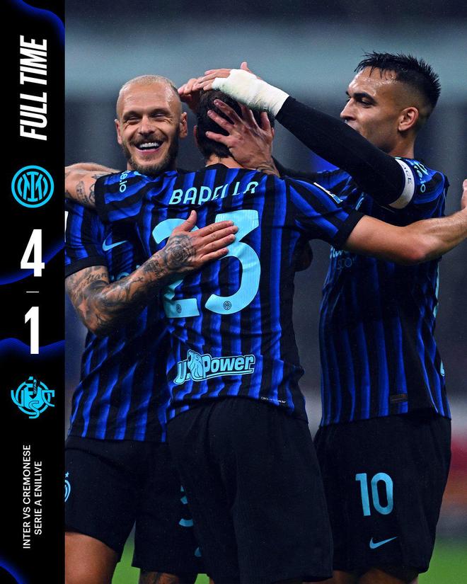 雷速体育10月5日宣 稍早前结束的意甲第6轮比赛中,国米主场4-1大胜克雷莫纳,各项赛事收获五连胜。