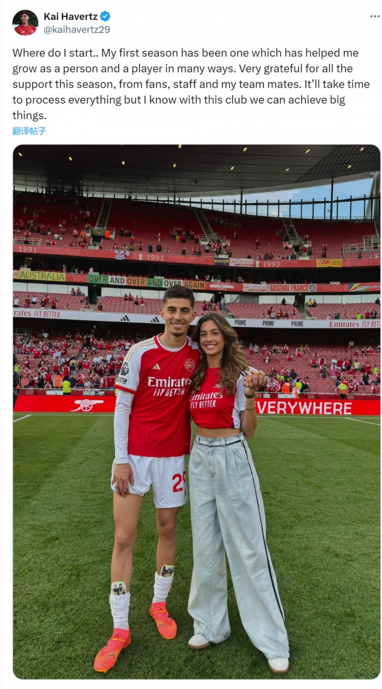哈弗茨晒出与女友在球场内的合照,并写道:“我该从何说起呢?在阿森纳的第一个赛季让我在很多方面得以成长,无论是作为一个人还是球员。非常感谢本赛季球迷、工作人员和队友们对我的支持。凡事都需要时间,但我知道在这家俱乐部,我们可以取得巨大的成就。”