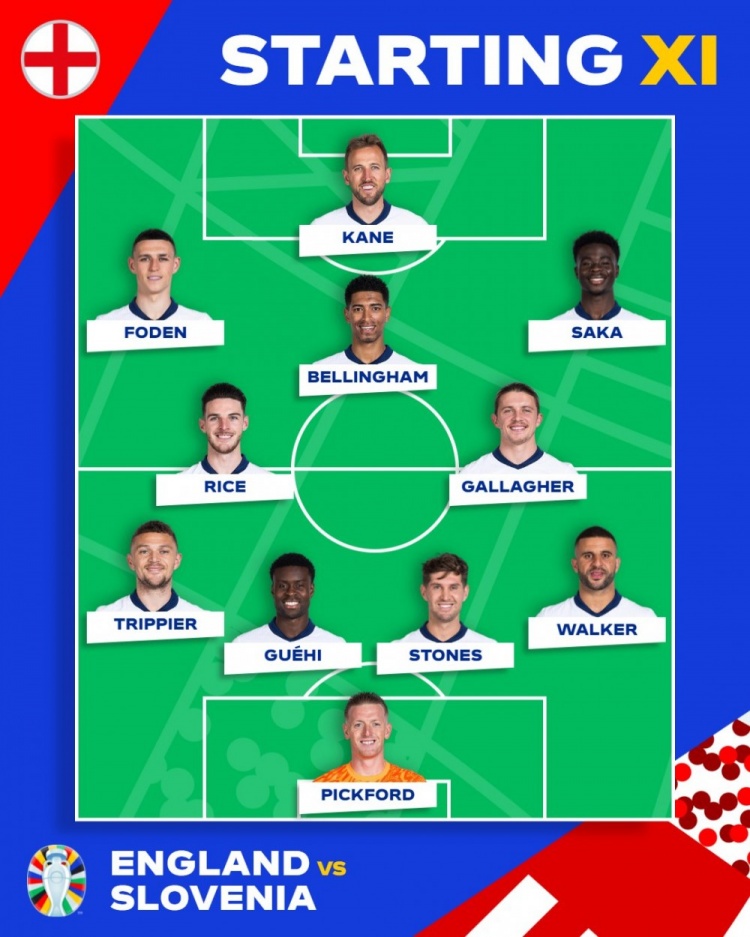 6月26日报道 欧洲杯小组赛C组第3轮,英格兰对阵斯洛文尼亚,斯通斯、皮克福德均首发出战。