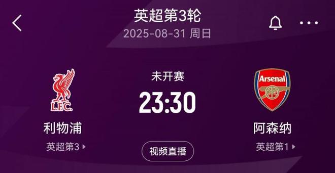 北京时间8月31日晚23:30,英超第3轮,利物浦将坐镇主场迎战阿森纳。