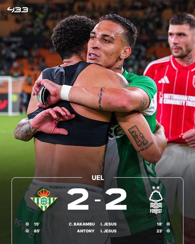 虽然未能获得本赛季的欧战资格,但在欧战舞台上从不缺乏“曼联元素”!在欧联杯联赛阶段第1轮皇家贝蒂斯vs诺丁汉森林的比赛中,双方2-2握手言和。曼联弃将安东尼贡献1传1射,发挥出