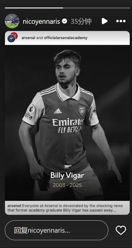 李可更新社媒,悼念去世的前阿森纳青训球员比利维加