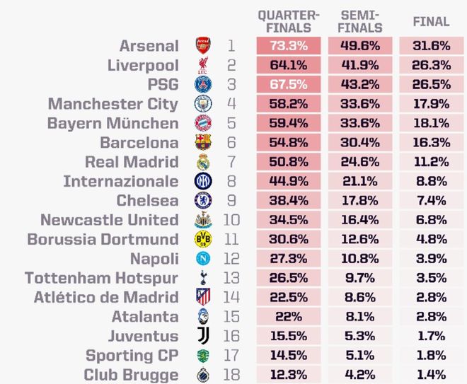 雷速体育10月2日宣 权威统计机构使用超级计算机进行计算后,认为阿森纳是本赛季欧冠的最大热门,利物浦、巴黎、曼城、拜仁、巴萨、皇马、国米、切尔西紧随其后。并给出了各大豪门进展到赛事各个阶段的预测概率,如下表所示。