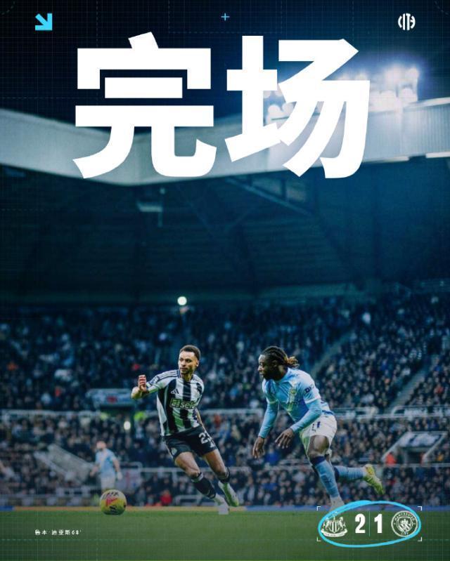 全场比赛结束,曼城客场1-2不敌纽卡斯尔联。