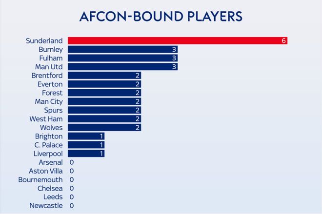 本届非洲杯,共有32名英超球员参加。如上图所示,“黑猫”桑德兰受影响最大,共有六名球员被征召。