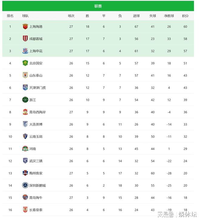 北京时间10月17日晚,2025赛季中超联赛,第27轮先战三场。本轮成都蓉城主场战胜梅州客家,上海申花客场小胜青岛西海岸,而上海海港也在青岛击败海牛拿到3分。中超联赛积分榜本轮上