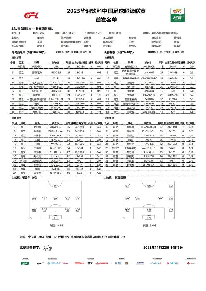 北京时间11月22日15:30,中超 第30轮,青岛西海岸主场迎战长春亚泰,赛前双方球队首发名单公布如下: