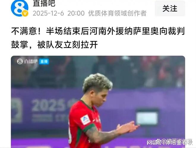 在足协杯决赛中,志在夺冠的河南队0-3完败于北京国安,再次与冠军奖杯失之交臂。丢冠已经够闹心了,今天河南队又被推上了风口浪尖。转播镜头中一个细节突然在社交平台上传播开来,河南队的外援纳萨里奥在比赛终场时朝韩国主裁判高亨进鼓掌。